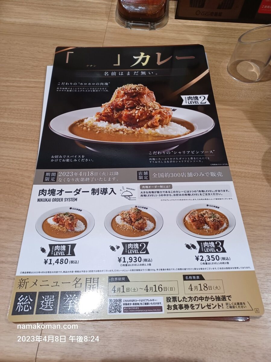 人気投票の結果、6つの候補の中から最終的にナナシカレーの名前は「ホロ肉ドカンと豪快カレー」に決定し、最初の提供期間が終了しました。