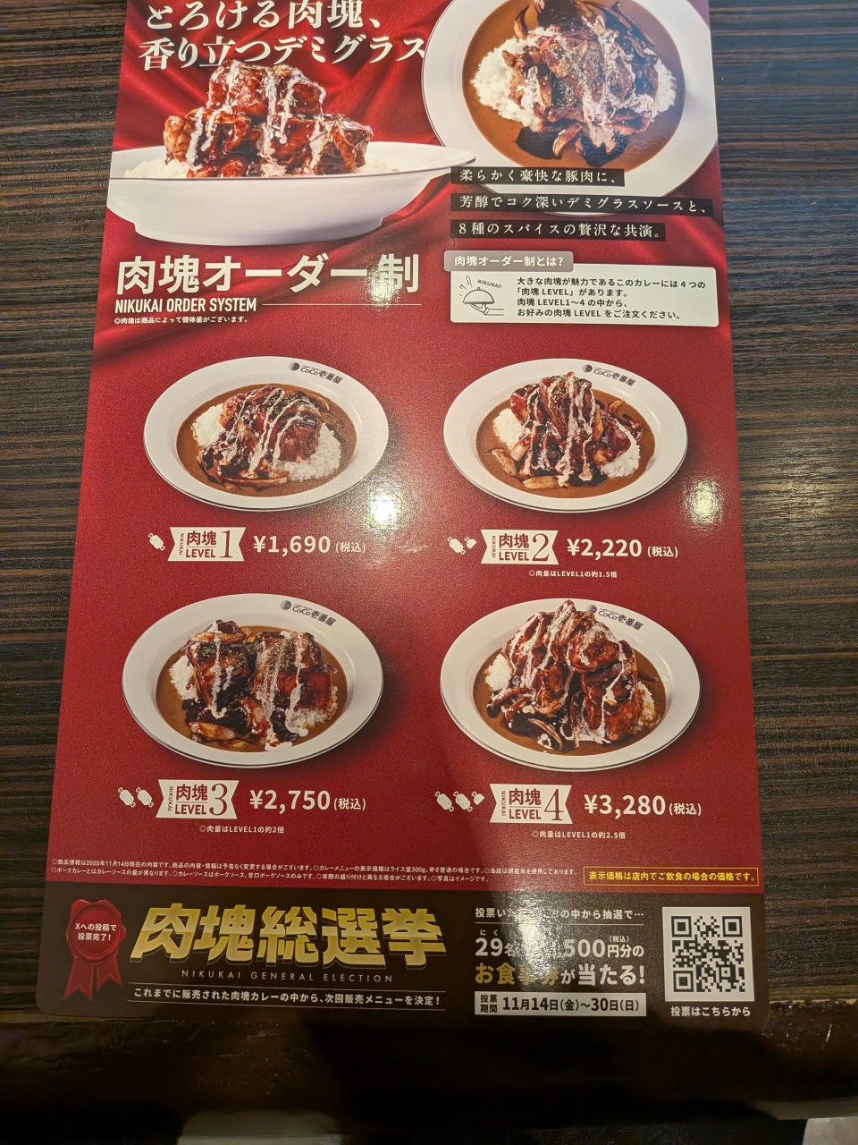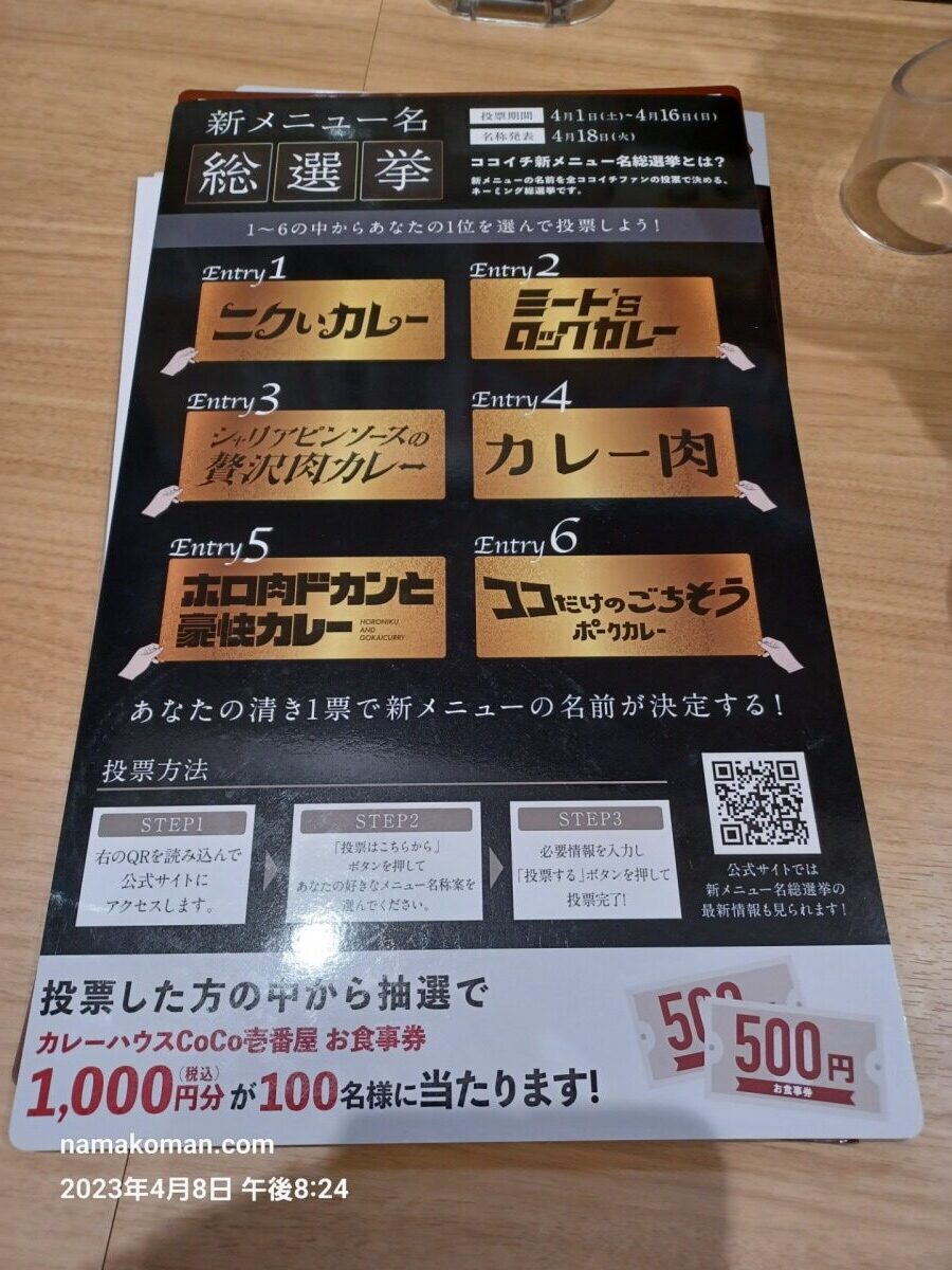 さらに、投票者の中から抽選で29(ニク)名にココイチのお食事券3500円分がプレゼントされるキャンペーンも実施されていますが、これはほぼ、肉塊レベル4の価格に相当します。一般的なカレーにトッピングをしても2~3杯分食べられるだけの金額でもあるので、仮に当選したらどう使うか悩ましいです。