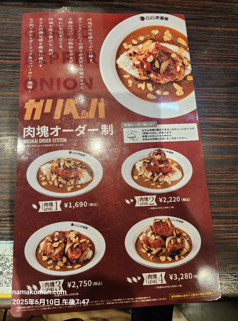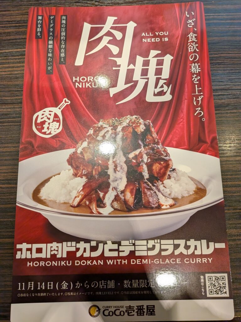 ココイチの肉塊を忘れかけていた頃。2025年5月23日に肉塊第4弾「ホロ肉ドカンとガーリック&ペッパーカレー」が登場しました。これまでと同様に、一部店舗限定での販売です。