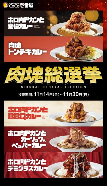 さらに、今回は肉塊シリーズ第5弾を記念し「肉塊総選挙」という企画も行われています。その名の通り、今までの肉塊カレーたちの中からお気に入りのものに投票するという企画で、1位のものは2026年5~6月頃に再販されるとのことです。
