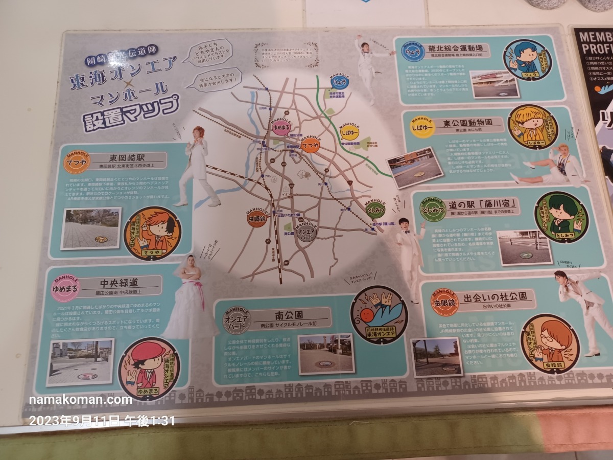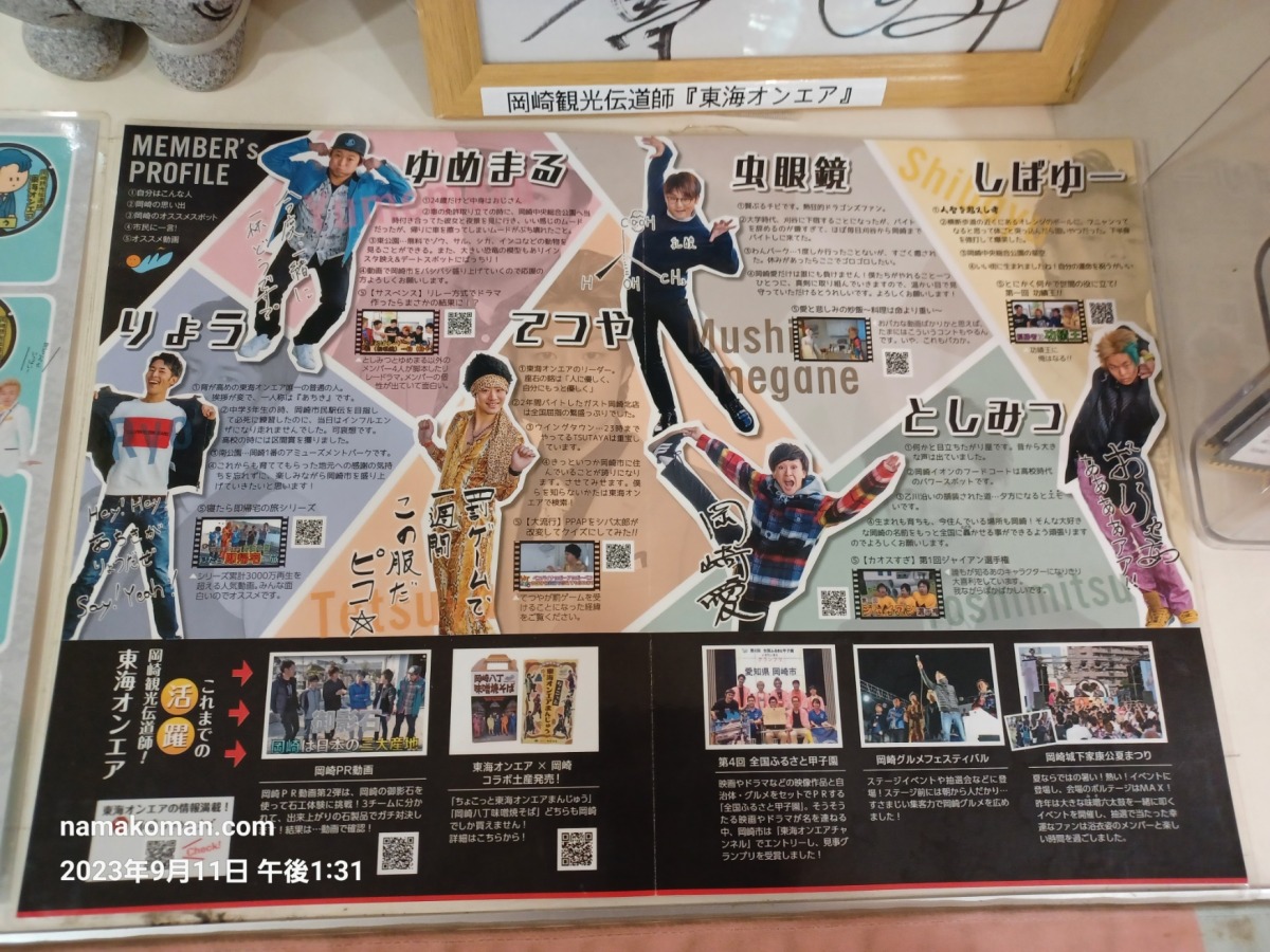 東海オンエアは2016年に岡崎市より「岡崎観光伝道師」に任命されており、町おこしにも積極的です。名鉄東岡崎駅の東改札口では、彼らが岡崎市内のスポットを紹介する動画が流されているほか、岡崎市内各地には彼らをデフォルメしたキャラクターの描かれたマンホール蓋が設置されていますし2、岡崎城公園の土産物店「観光みやげ店 おかざき屋」にも、彼らのグッズが並ぶ一画があります。