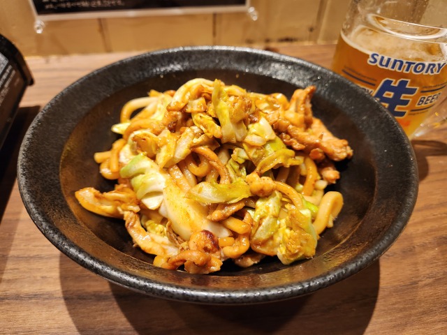 それはまさに、記憶の中の本家白川けいちゃんの美味しさに違わぬ味わいでした。芯までタレの味が染みた鶏肉が、高火力で歯ごたえよく焼き上がっています。鶏肉にしっかりとタレが絡み、染み込んでいるからこそ、野菜やうどんと一緒に炒めるだけで簡単にボリューム満点の一品が仕上がります。甘みとコクと絶妙な塩味が、芯まで鶏肉に染み込んでいます。どこを噛み締めても旨いのがずるすぎます。そして、鶏の脂がキャベツにもうどんにも絡んでいます。これは、ビールが進む進む!