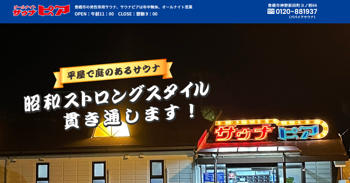サウナピアは愛知県豊橋市の郊外、神野新田町にある男性用サウナです。120℃もの高温になるフィンランドサウナが名物で、しっかりと汗をかきととのうことができます。オールナイト営業をしており、宿泊や仮眠も可能です。