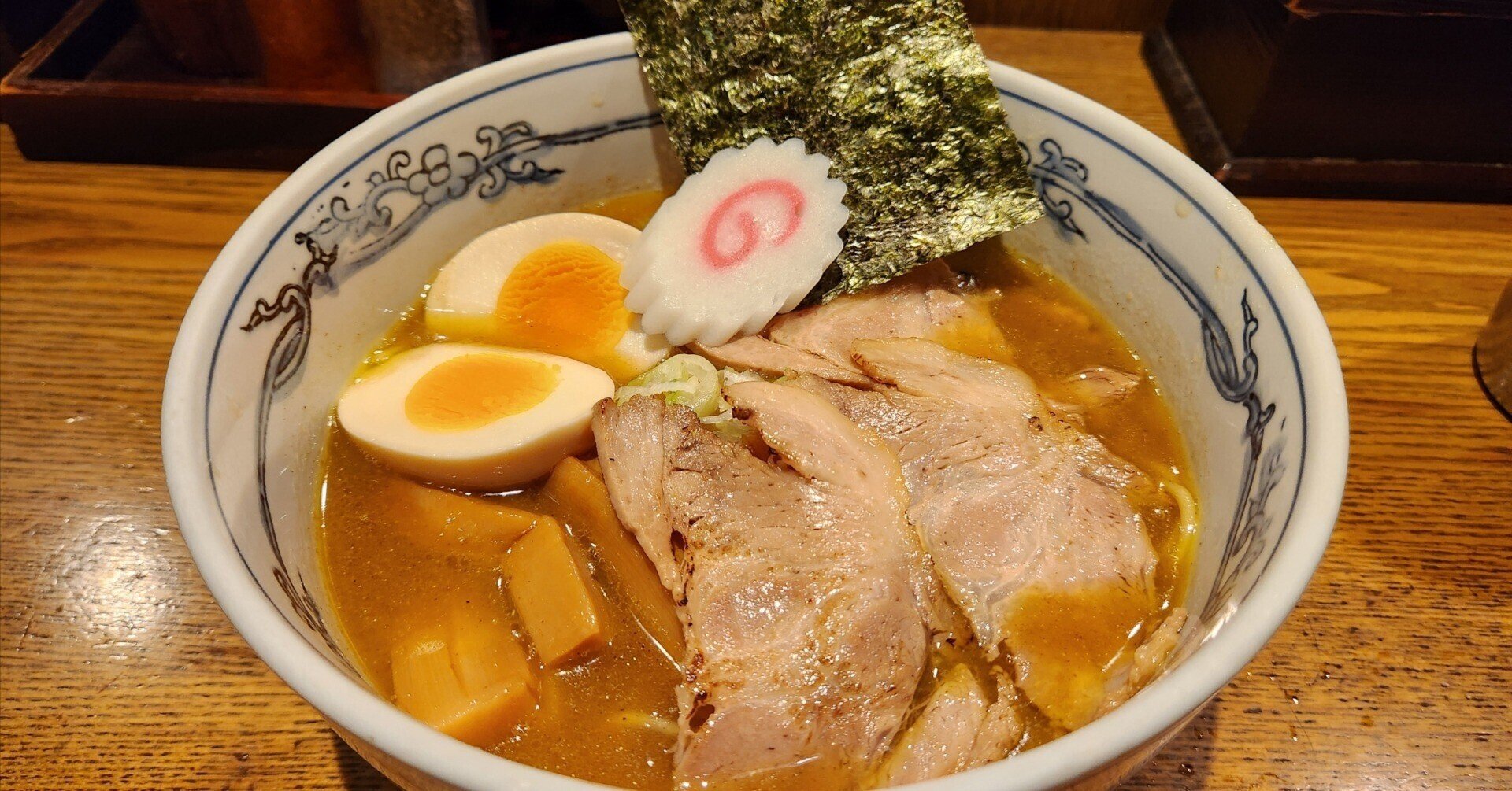 トッピングとして、ネギ、チャーシュー、海苔、煮卵、メンマ、なると、スライス玉ねぎが入っています。チャーシューは厚く大切りで食べ応えがあり、甘辛いタレの味がとてもよく染みています。メンマも極太で、チャーシューと合わせて食感が非常に楽しいです。