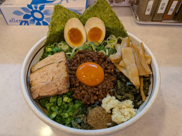 醤油の風味と、唐辛子やニンニクの刺激がたっぷりの台湾ミンチはとても濃く、食欲を刺激する味わいです。ニラ、ネギ、ニンニク、魚粉、海苔といった薬味類との相性が絶妙なんですよね。ネギとニラのシャキシャキとした食感とツンとする辛味は、唐辛子やニンニクの辛味とはまた別ベクトルで一口一口に刺激をもたらしますし、海苔と魚粉の風味が台湾ミンチの辛味に奥行きを加えます。