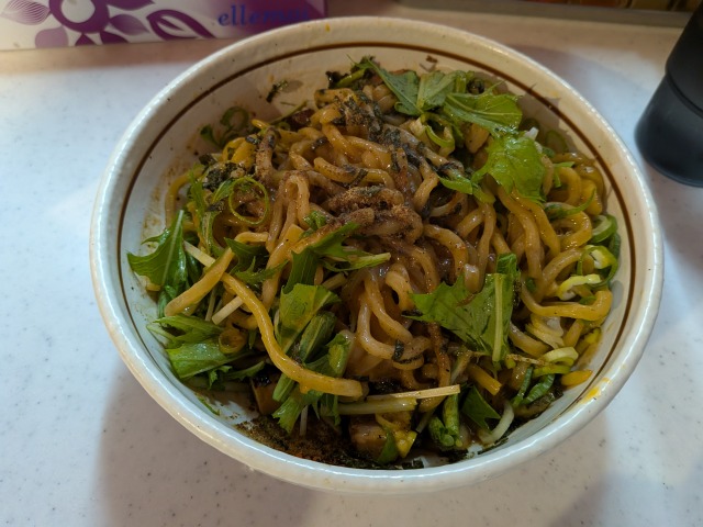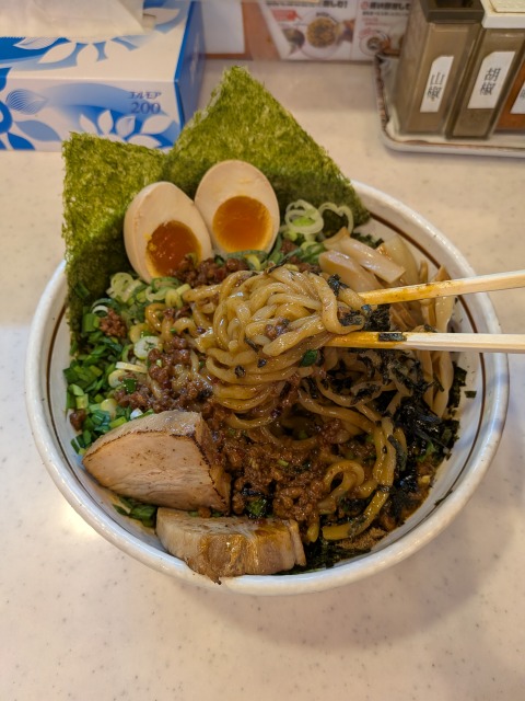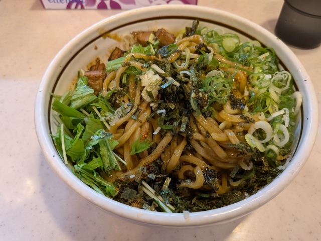 「汗はかきたくないけれど、濃い味のまぜそばをガッツリと食べてスタミナを付けたい」という、夏場の欲望にとても丁度良くフィットする一杯でした。辛くない分、タレや麺の味わいをゆっくりと感じながら食べられるのも利点ですかね。