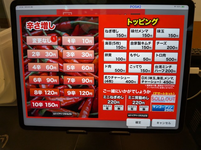 なお、タブレットにて注文する際に、辛くないはずのキミスタでも何故か「辛さ増し」を注文することが可能となっています。