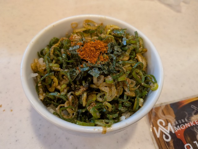 あとは220円のサイドメニュー「ネギ飯」も旨いんですよ。ご飯の上にたっぷりの刻みネギをかけて、その上からさらにごま油、醤油、すりごま、粉唐辛子をかけた一品です。ネギの辛味が粉唐辛子の辛味で引き立ちますし、さらにごま油醤油とすりごまの香りがとてもクセになります。まぜそばと組み合わせるのが前提のメニューではありますが、これ単体でもガツガツモリモリと喰らいたくなります!