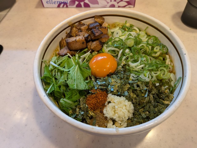 実は麺屋はなびには「辛くない台湾まぜそば」というメニューもあったのですが、それ以上に心惹かれたのが「キミスタ」でした。ゴロゴロの角切りチャーシューがたっぷりと入ったビジュアルが、とても魅力的だったんですよ!チャーシュー以外には卵黄、魚粉、刻み海苔、水菜、刻みネギ、にんにくが入っています。