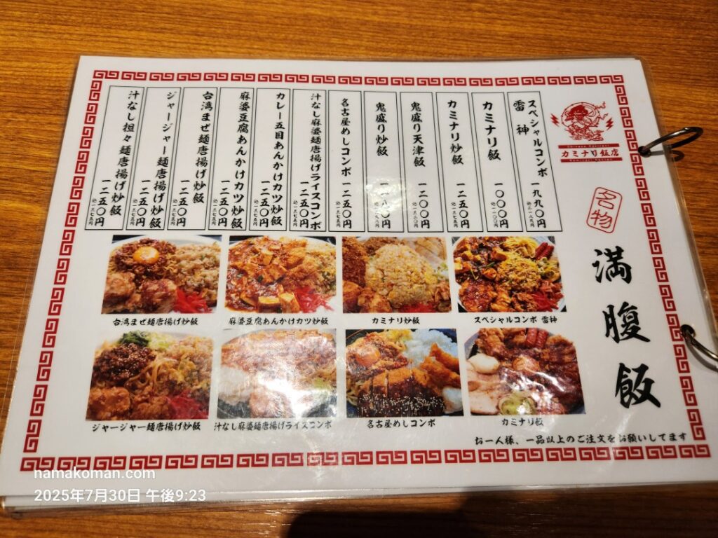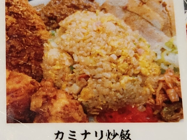 店名を冠した「カミナリ炒飯」は、高火力で香ばしく仕上がったチャーハンの周囲に、ロースカツ、からあげ、キーマカレー、ウインナー、チャーシュー、キムチ、紅ショウガを盛った一品です。チャーハンとおかずは一緒に食べたときの味のバランスも良く、これが「カオスな盛り合わせ」ではなく「完成したスタミナ飯」であることを実感させられます。