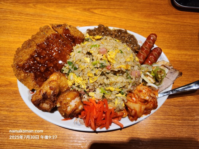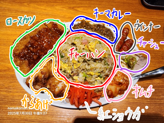 チャーハンの山を取り囲むように、ロースカツ、キーマカレー、ウインナー、チャーシュー、からあげといった、茶色いボリュームおかずの精鋭たちが並んでいます。箸休めにキムチと紅ショウガも付いてきます。