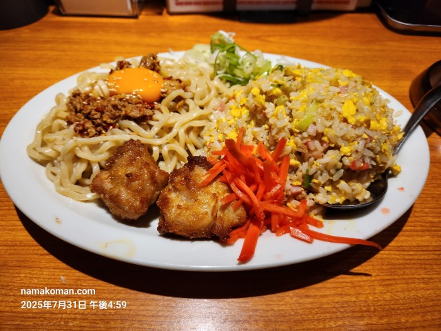 台湾ミンチを乗せた汁なし麺とチャーハンを相盛りし、からあげと紅ショウガを乗せています。台湾まぜ麺は、歯ごたえある太麺に、程よい辛味の台湾ミンチが心地よく絡んでいます。魚粉のパンチある旨味も効いています。そんな台湾まぜ麺を、香ばしいチャーハンに、ジューシーすぎるからあげと一緒に味わうわけなので、得られる満足度はかなりのものです!