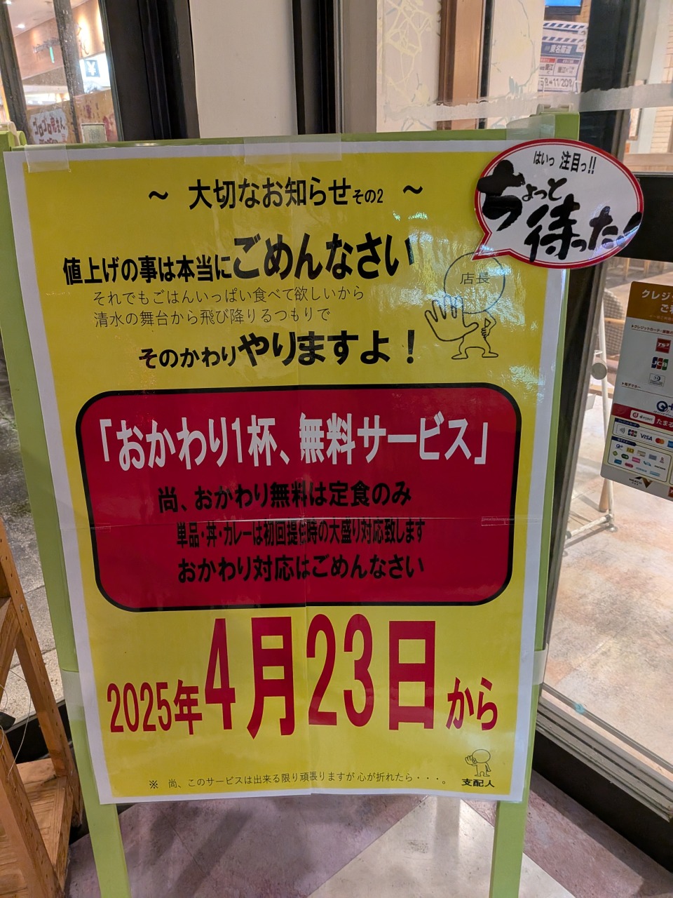 エントランスに掲げられたお知らせボードには、昨今の物価高による値上げを詫びつつ、その埋め合わせとしてご飯のおかわりが1杯無料になる旨の告知が掲げられていました。