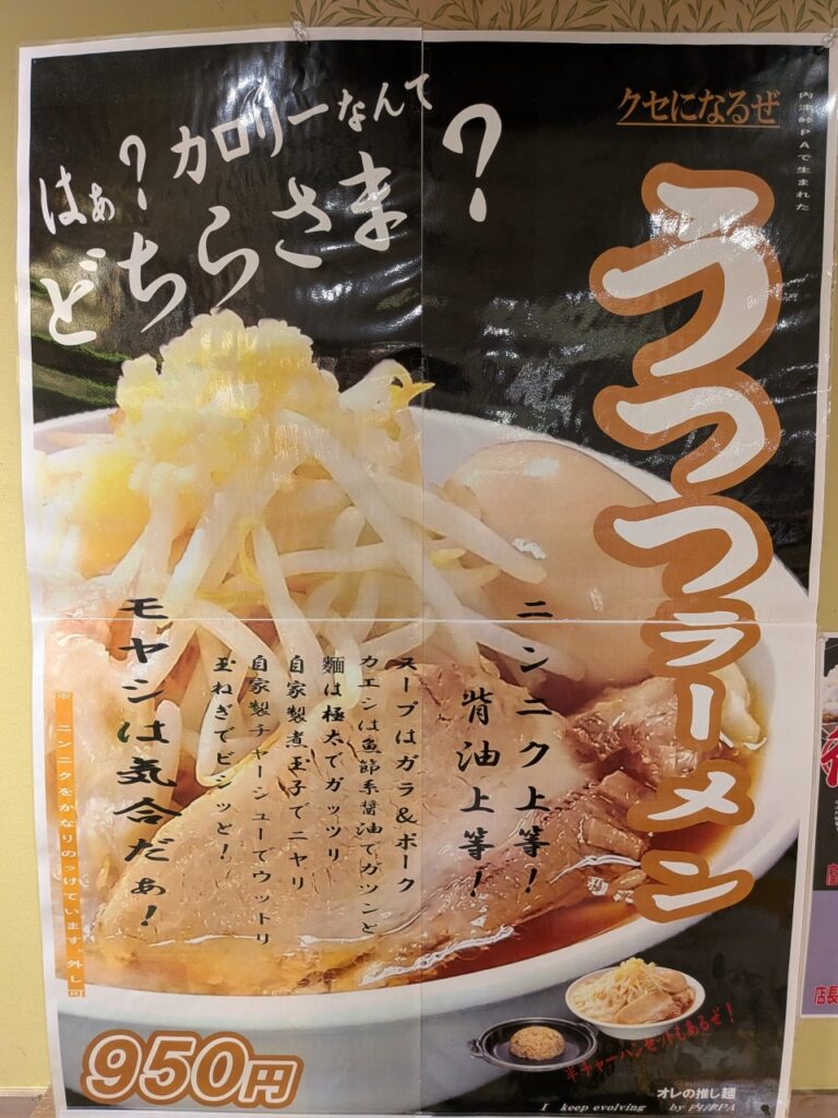 施設名を冠した看板メニュー「うつつラーメン」は、二郎系のごときマシマシなビジュアルですが、スープは鶏ガラ醤油に魚介節醤油から構成されています。一般的な二郎インスパイア系ラーメンとは一味違った印象ですね。若干すっきりしていそうです。
