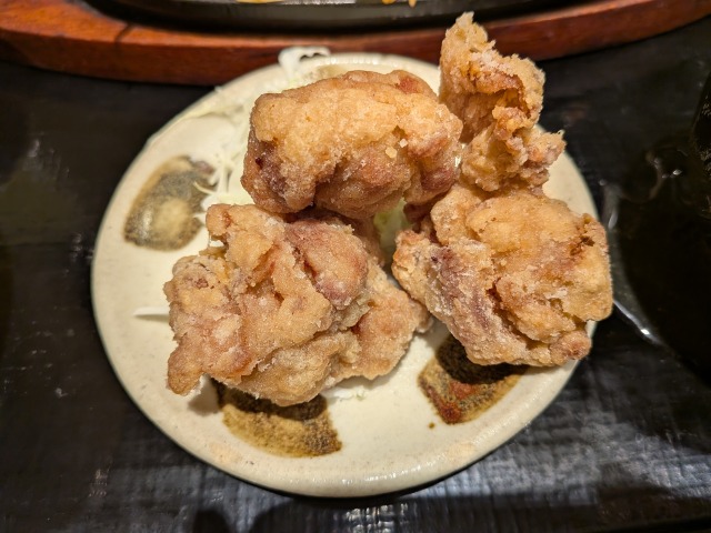 今回は唐揚げセットを注文したので、からあげも3個付いてきます。山ちゃん風のスパイスと、申し訳程度に2口分ぐらいの千切りキャベツも付いてきます(笑)鶏もも肉に、ニンニク醤油ダレがしっかりと染みており、肉汁と一体化します。こちらもご飯のお供として優秀な味の濃さです。