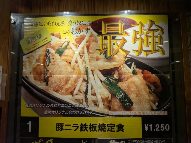 いやぁ。「最強」を自称するだけのことはありますよ。この豚ニラ鉄板焼、とても旨いです。熱がしっかりと通りつつも、もやしのシャキシャキ食感は失われていませんし、ニンニク醤油の味付けもご飯が進む塩梅です。醤油は辛味がありつつもまろやかな口当たりで、ニンニクは辛味も刺激も抜群の生ニンニクです。