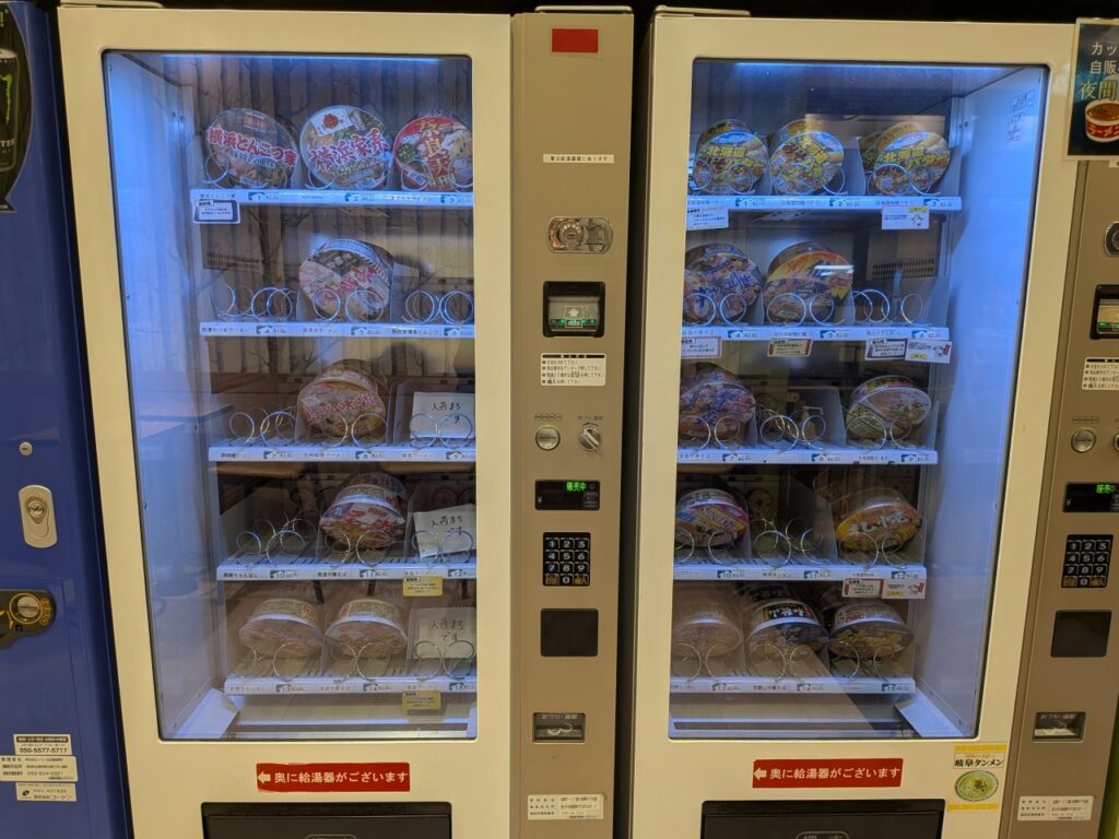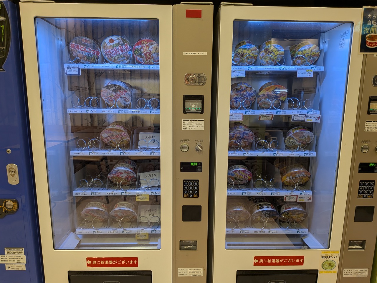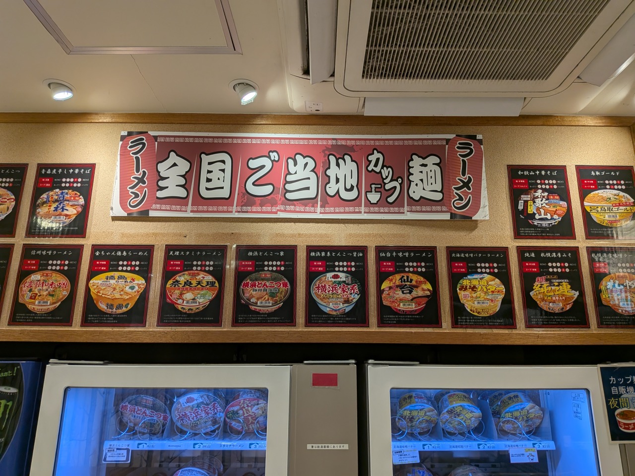 フードコートの営業していない時間帯でも、カップラーメンの自動販売機を利用可能です。「全国ご当地カップ麺」と称して、各地のご当地ラーメンを再現したニュータッチの凄麺が販売されています。