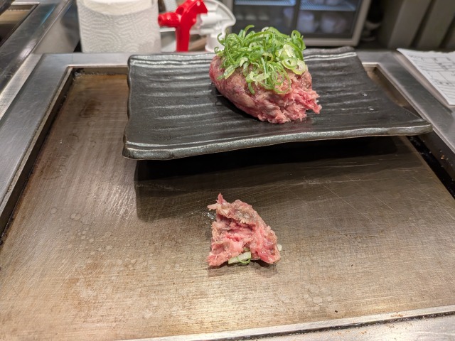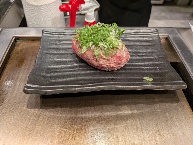 ペチペチと仕上げられたハンバーグは、鉄板で表面と裏面に焼き色が付く程度に加熱され、目の前に提供されます。