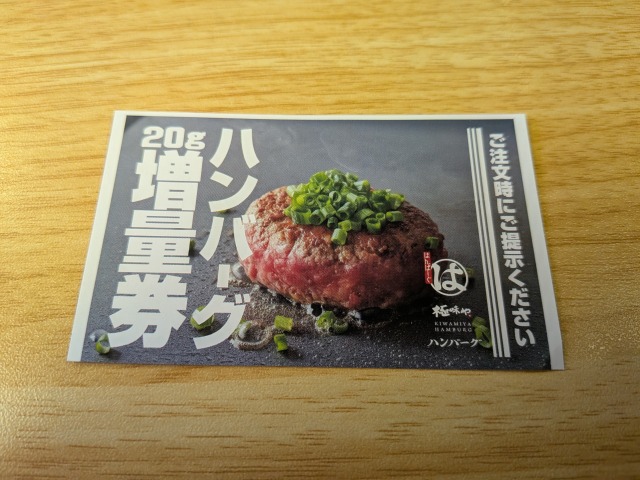 極味やハンバーグステーキの20g増量サービス券です。せっかくもらったわけだから、使っておきたいと思うのが人の情です。後日、サービス券を使うために再訪問してきました。サービス券は注文のタイミングで提示します。