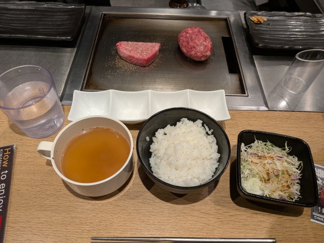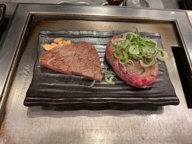 今回は極味やハンバーグステーキに加え、特選伊万里牛ステーキも注文してみました。伊万里牛は、佐賀県の伊万里市にて飼育されている高級黒毛和牛です。サシがすごいです!こちらもハンバーグと同様にレアで提供され、鉄板で好みの焼き加減に加熱してから頂きます。ステーキはガーリックチップ無しにもできます。