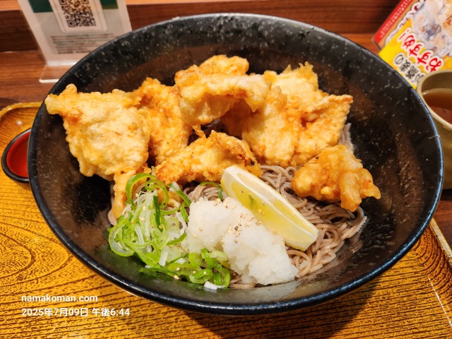 自家製麺のそばをリーズナブルに味わえるほか、夜の時間帯には安価にチョイ飲みができる一品料理も充実します。おすすめは「鶏天そば」です。柔らかい鶏むね肉の天ぷらが、通常サイズでは5個、特盛にするとなんと8個も乗って出てきます。