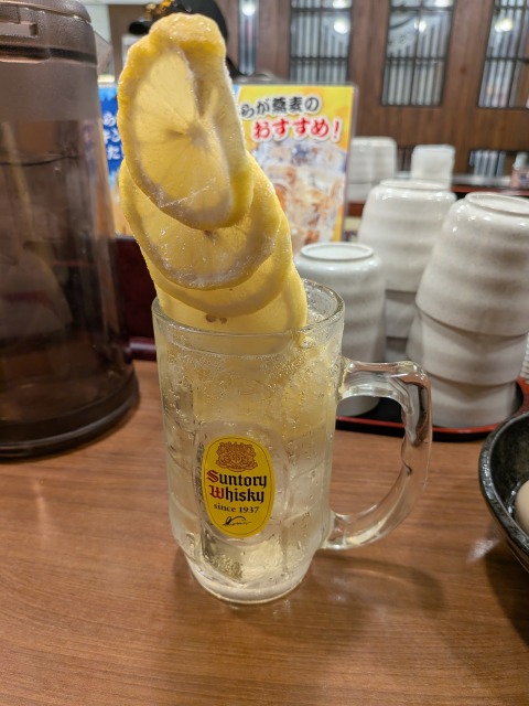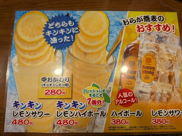 数あるお酒の中から「キンキンレモンハイボール」を注文しました。最近、こういう凍結レモン系のお酒が好きでよく飲んでいます。フレッシュなうえに、そのフレッシュさが長続きしますし、何より写真映えするビジュアルでもあります。今回のキンキンレモンハイボールはレモンを丸1個分使用しているのですが…上の方意味あるのかな(え)