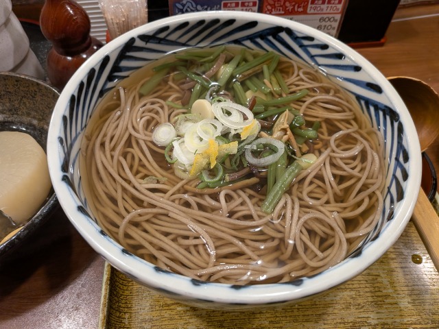 トッピングはネギ、ゆず皮、山菜のみというシンプルな構成ゆえに、つゆとそばの味をしっかりと楽しめます。温かいそばはつゆの口当たりが優しく、そばも柔らかく、ほっとする味でした。