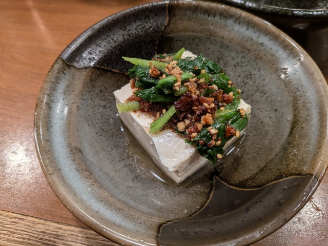 さっぱりとしたおつまみも欲しくて「サクサク醤油のにら冷奴」も注文しました。絹豆腐の上に、ガーリックチップの入った「食べるラー油」風の醤油ダレとニラが乗っています。濃くてパンチあるタレと、絹豆腐のさっぱりとした口当たりとの対比がたまりません。もちろんハイボールも進みます。