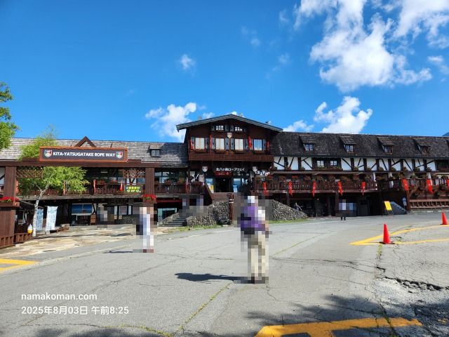 曲がりくねった高原の道路を、案内標識に従いつつ、少しずつ標高を稼ぎながら登っていくと、標高1771m地点の、北八ヶ岳ロープウェイ山麓駅に辿り着きます。車を600台停められる、無料駐車場があります。