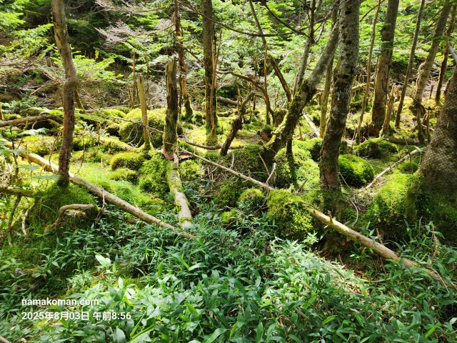 遠くの方に、立ったまま枯れる針葉樹の姿が見えます。高山では、シラビソやオオシラビソの立ち枯れが規則的に発生し、遠くから見ると縞模様のように見えることから「縞枯れ」と呼ばれるのだそうです。