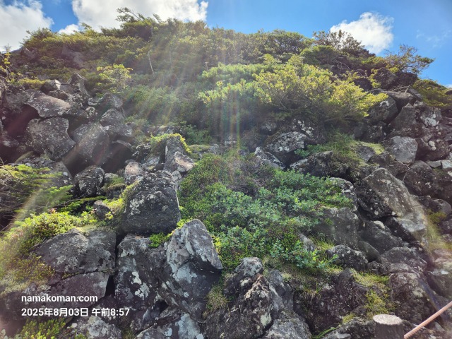 真っ黒な溶岩の上には、背の低い高山植物が這うように茂っています。