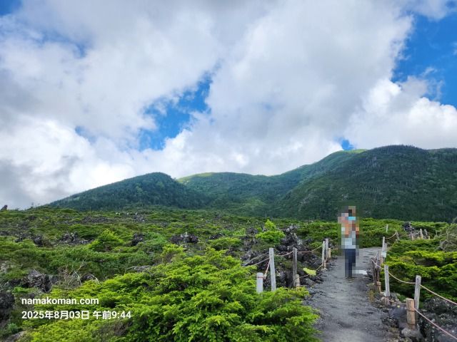 登山道をある程度登ったところから、坪庭方面を振り返ってみました。視界一杯に広がる溶岩台地の上を絨毯のように高山植物が覆っています。散策路から眺めることができていた範囲が、あくまで「氷山の一角」でしかなかったことに驚かされます。このスケールの大きさには、圧倒されるしかありませんでした。