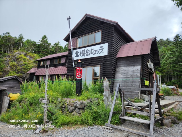 坪庭散策路から、登山道をしばらく進むと山小屋「北横岳ヒュッテ」が現れます。周囲には休憩可能な広いスペースが設けられているほか、北横岳ヒュッテにて緊急時の飲み物の補給や、トイレの利用なども可能です。ただし当然ながら価格はロープウェイ山麓駅などと比べると高額ですし、トイレも維持管理のために利用料金の徴収があります。