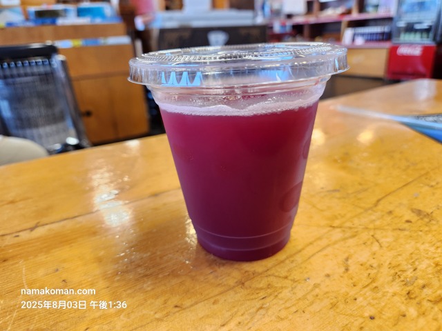 「こけももジュース」を頂きました。コケモモは高山のような冷涼な場所の地面に這うように生える、とても背の低い低木で、食べられる赤い実をつけます。そんなコケモモを使用したジュースです。登山後の体に染みる、きゅんとした酸味がありましたが、同時に濃厚な甘さも感じました。