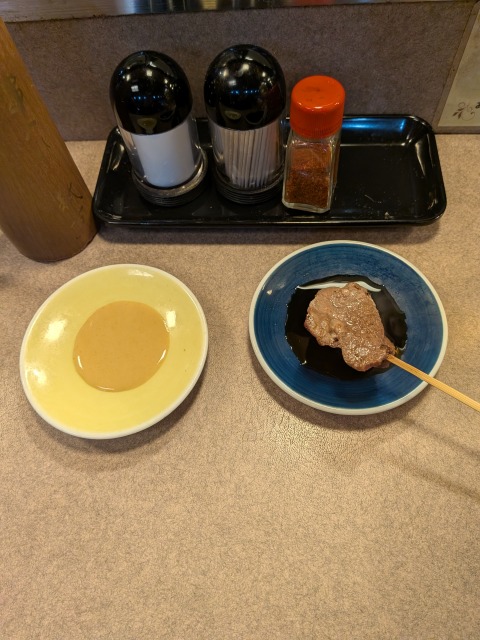 カラシやタレの小皿も一緒にやってくるので、ちびちびと浸けて頂きます。丁度一口でいけそうなサイズです。