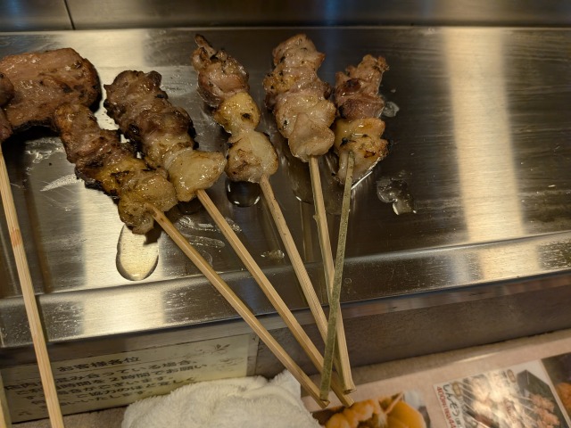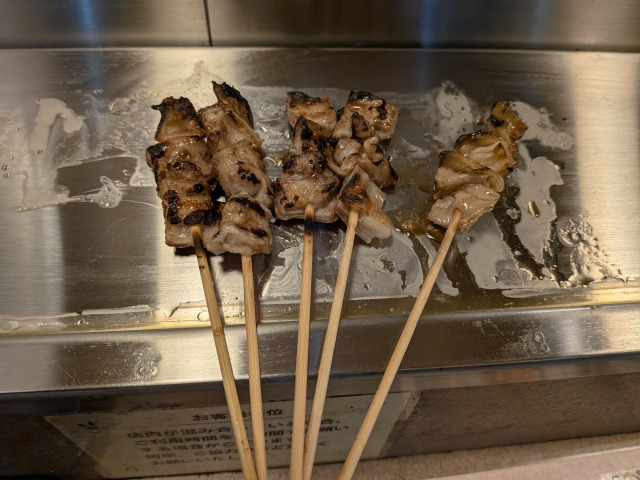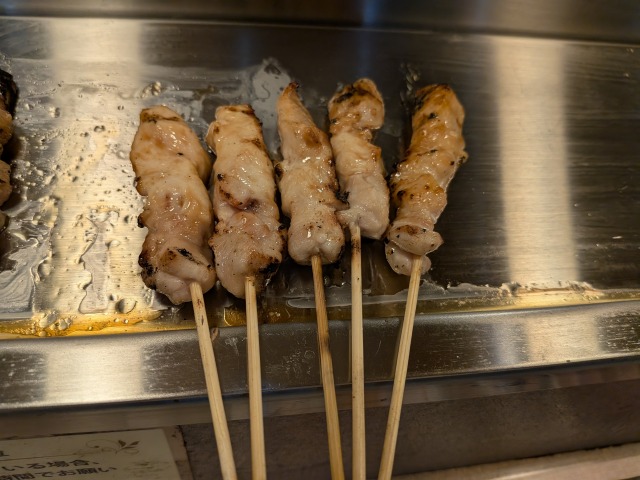 焼き鳥屋なので、鶏肉も食べておきたいですよね。秋吉の名物メニュー「純けい」を注文しました。これはいわゆる「かしわ」や「親鳥」のことで、産卵後の鶏の串焼きです。