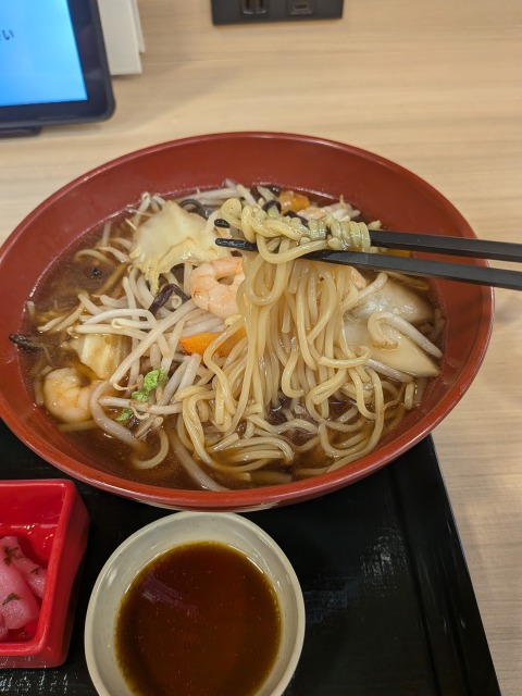 あっさりスープに、あっさり味の餡の組み合わせが良いですね。ぷつんと切れる食感の麺も大好きです。たけのこ、エビ、豚バラ、もやしなど、豊富に入る具材の食感もとても楽しく、食後の満足感はかなりのものです。それでいて、重すぎないのも嬉しいです。