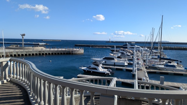 整備されたマリーナの奥に、水平線が広がっています。空もスカッと気持ちよく晴れて、最高の行楽日和でした。