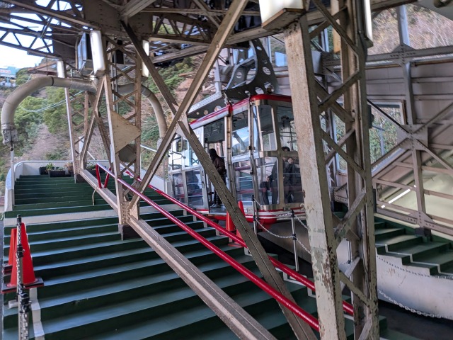 知らない山(上の山バス停)から、なんとかアタミロープウェイ山麓駅までやって来ることができました。アタミロープウェイは熱海市南部の八幡山という山に設けられており、山麓駅と山頂駅の間は高低差96m、運行間隔3分30秒となっています。