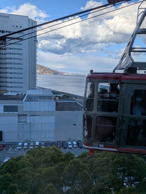 アタミロープウェイは、熱海港に乗り場(山麓駅)があり、八幡山にある山頂駅に向けて片道3分30秒、高低差96mの索道を進むロープウェイです。10分間隔で運行しています。