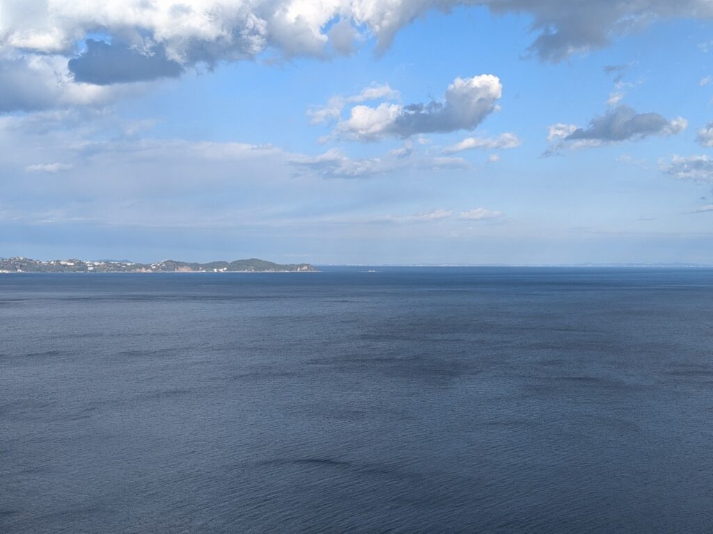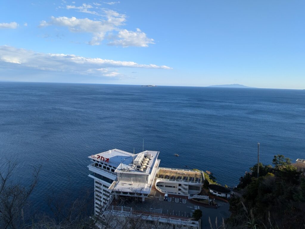 海のほうも見てみます。ホテルニューアカオの向こうには相模灘の水平線が広がっており、初島と、伊豆大島が浮かんでいます。