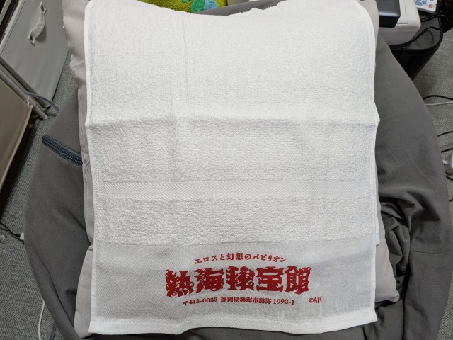 銭湯タオル風の熱海秘宝館タオルを購入しました。白いタオルに赤字で「熱海秘宝館」のロゴと住所が書き込まれており、銭湯タオルに擬態しています。熱海秘宝館のアパレルには他にもTシャツがありましたが、さすがに「秘宝館」すぎて普段使いできないと思いました…。