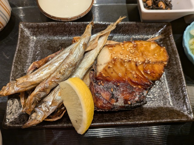 サバみりん干しにはしっかりと脂が乗っており、タレの甘じょっぱい味と相まってご飯がとても進みます。アジの開きには、ギュッと引き締まった身に、旨味も濃縮されています。「噛めば噛むほど」といういつものやつです。ししゃもも、身の部分に脂が乗ったホクホク食感で、卵に負けない存在感がありました。