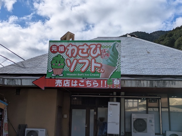 ちなみにこちらの看板に描かれた「元祖わさびソフト」は、緑の森のほうで販売されています。お腹の容量を考えて、今回はさすがに食べ比べはやめておきましたが、色合いからしてソフトクリームに満遍なくわさびが練りこまれているものと思われます。