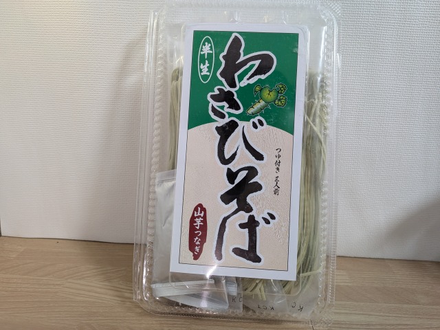 こちらは「わさびそば」です。つゆがセットになった、半生タイプのそばです。3食分入っています。