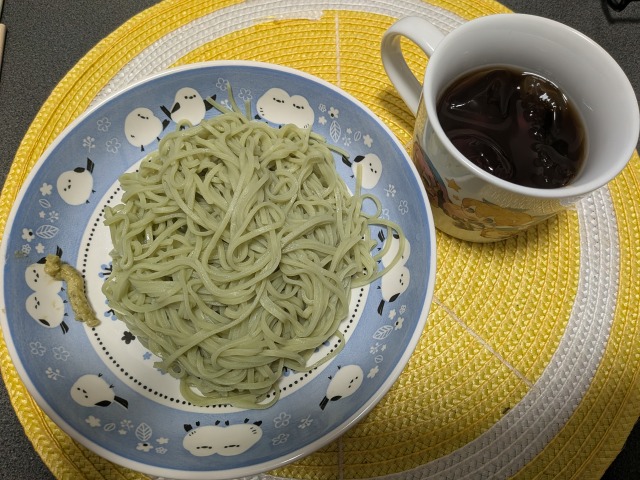 わさびの練りこまれた緑色の麺を、そのまま啜ってみますが…。これは特に辛いということはありませんでしたね。とはいえビジュアルはきれいなので、啜っていてとても楽しいです。