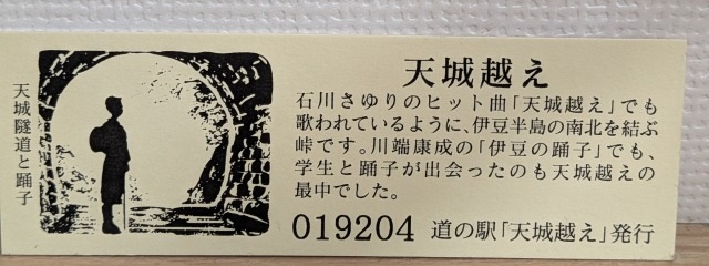 道の駅天城越えはその名の通り、楽曲や文学作品の舞台にもなった「天城越え」こと、天城山を越えるルート上にあります。楽曲の「天城越え」の歌碑がある浄蓮の滝や、「伊豆の踊子」で「私」が踊子と出会ったトンネル(天城山隧道)からも近く、浄蓮の滝および天城山隧道へ続くハイキングコース「踊子歩道」も通じています。