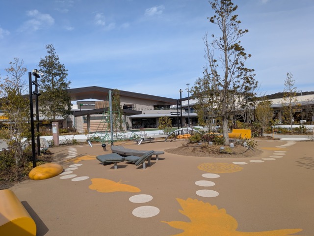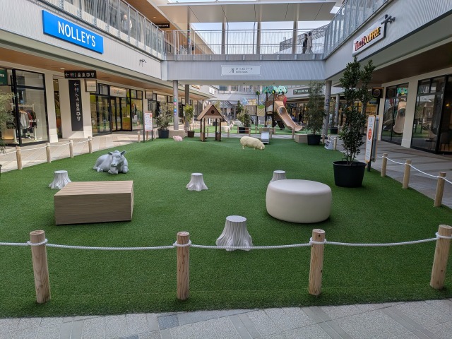 アウトレットゾーンもオープンモールとなっており、屋外の通路の両サイドに店舗の入った建物があります。各所に休憩スペースや、子ども用の遊具も設けられており、やはり天気の良い日には気持ちよく買い物をしたり、あるいは連れの買い物を待ったりできそうです。