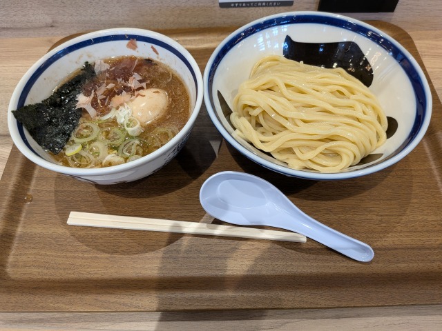 茶色く濁った濃厚なスープは、魚介と動物の旨味が力強く噛み合い、醤油のコクが際立つ味わいです。とにかく、鰹の香りが心地良いです。麺も滑らかなうえにコシがとても強いです。「濃厚な魚介豚骨スープで、冷たく締まったツルツルの麺を啜る」という、つけめんの原体験的な喜びを強く感じられる一杯だったように思います。チャーシューも甘く濃いタレの味が染みた、トロトロの仕上がりでしたね。