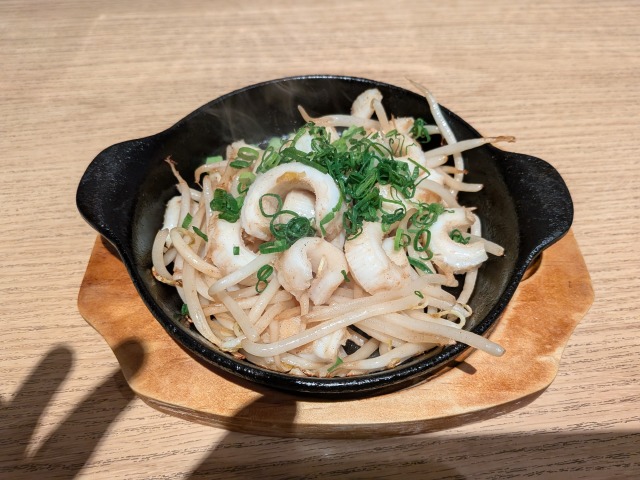 「マンボウ鉄板炒め」って…。いや、マンボウはわかりますよ。でも、食べようとするとこんな感じなんですか!?もやしと謎の白い物体を炒めてネギをかけたものが、熱した鉄皿に乗ってやってきます。